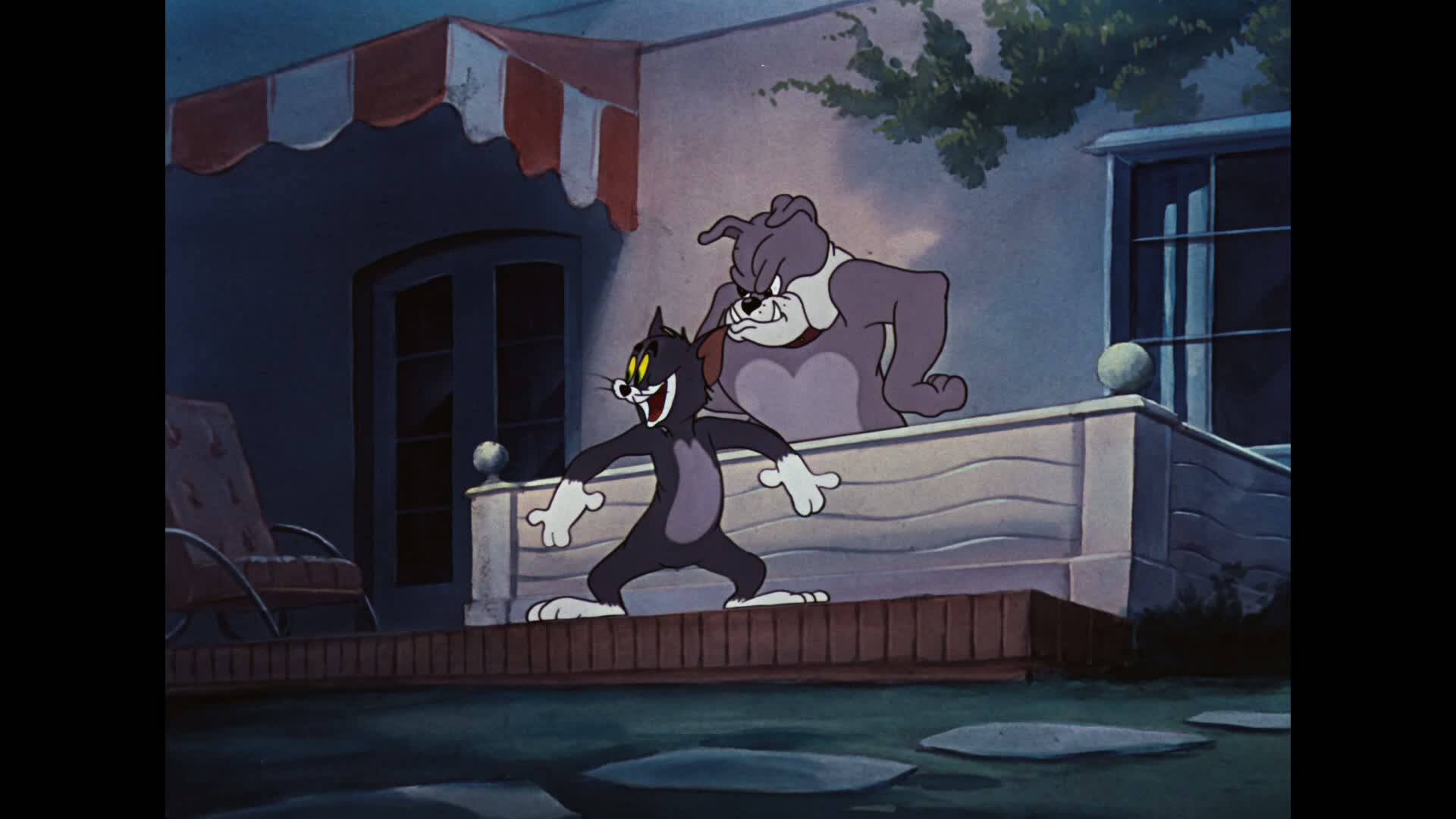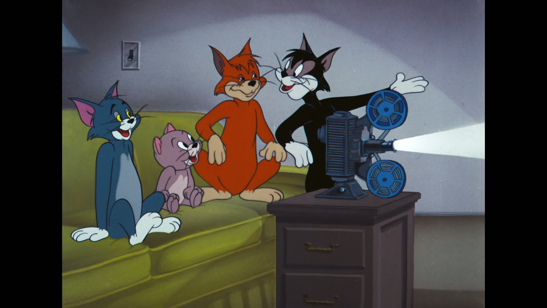 Nobody's home, so Tom invites his alley cat friends in to look at home movies (clips from earlier cartoons where Tom gets the drop on Spike). While they're showing them, Spike sneaks in.