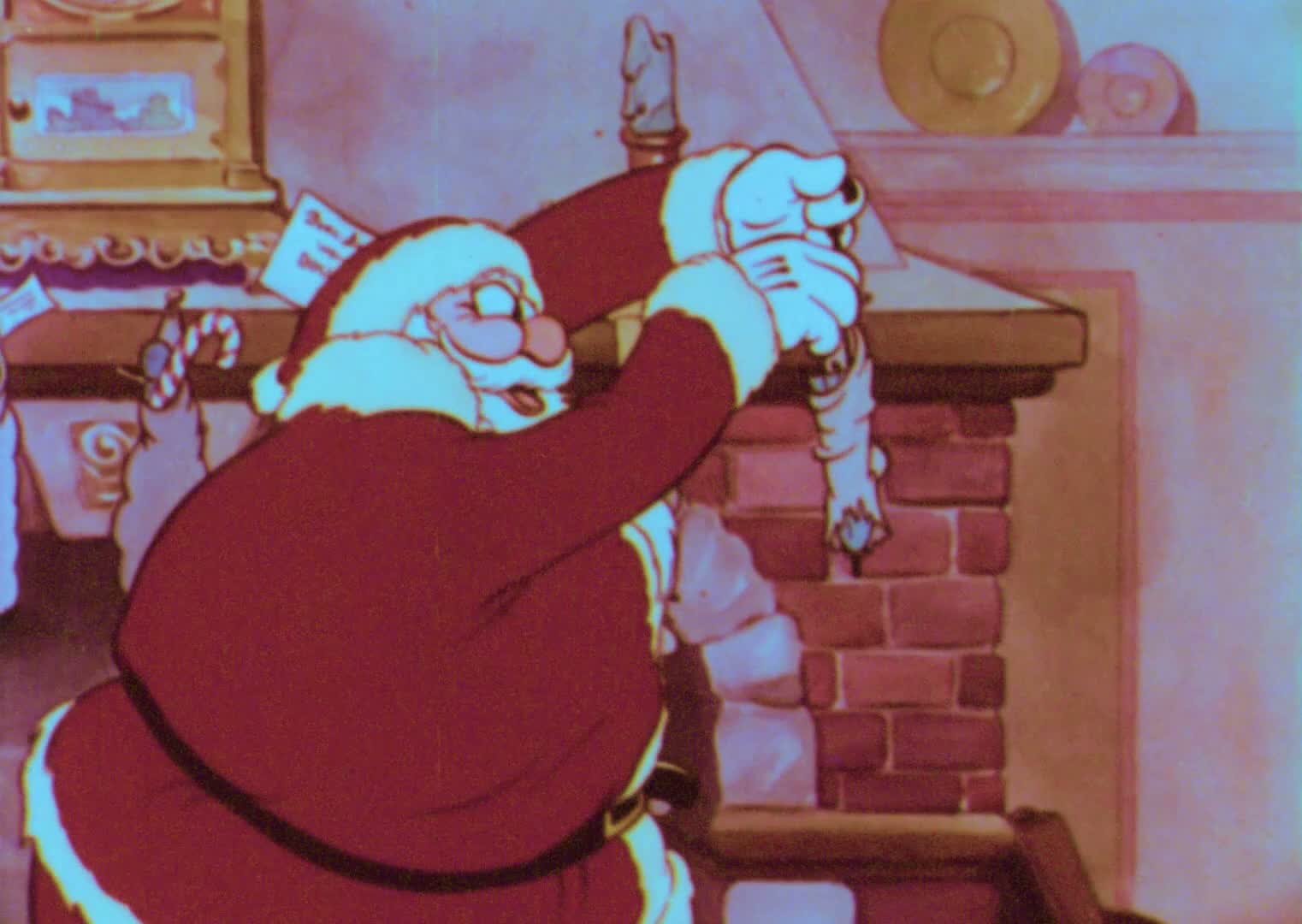 A narrator sings the opening stanzas of the classic poem while we see the house at rest. Santa lands on the roof, comes down the chimney, and opens his bag. The toys march out and decorate the tree, with the toy soldiers shooting balls from their cannon, a toy airplane stringing a garland like skywriting, and the toy firemen applying snow. A blimp delivers the star to the top. Meanwhile, Santa fills the stockings. His laughter awakens the children, who sneak out. The toys rush to their places, and Santa escapes up the chimney just in time.