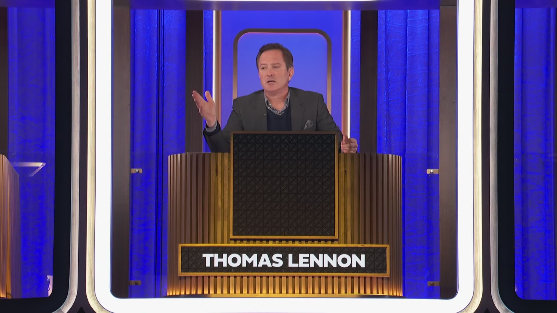 Two contestants play tic-tac-toe to win money and prizes. The "board" for the game is a vertical stack of open-faced cubes, each occupied by a celebrity seated at a desk and facing the contestants. The celebrities are asked questions and the contestants judge the legitimacy of their answers to win the game.
