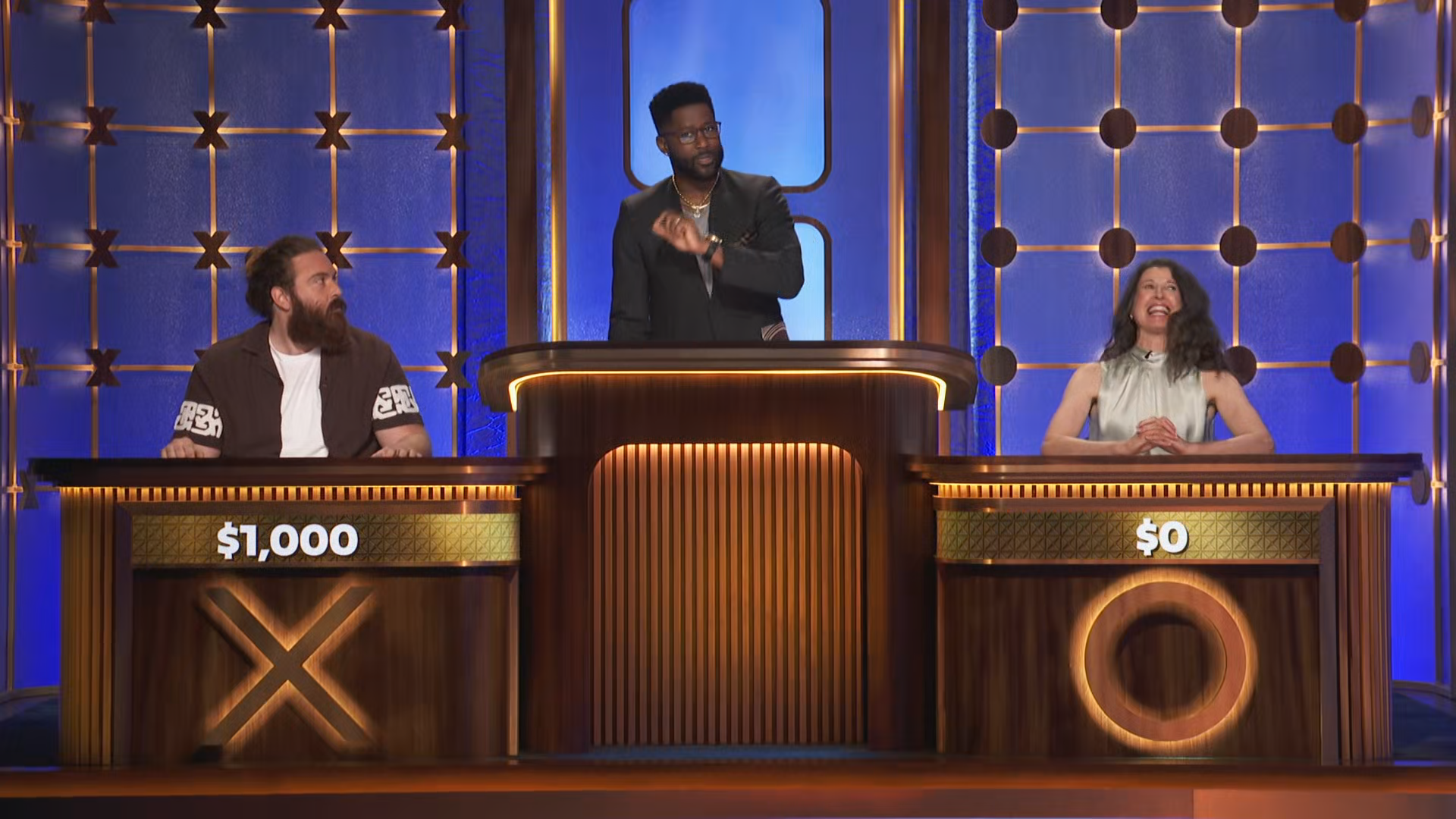 Two contestants play tic-tac-toe to win money and prizes. The "board" for the game is a vertical stack of open-faced cubes, each occupied by a celebrity seated at a desk and facing the contestants. The celebrities are asked questions and the contestants judge the legitimacy of their answers to win the game.