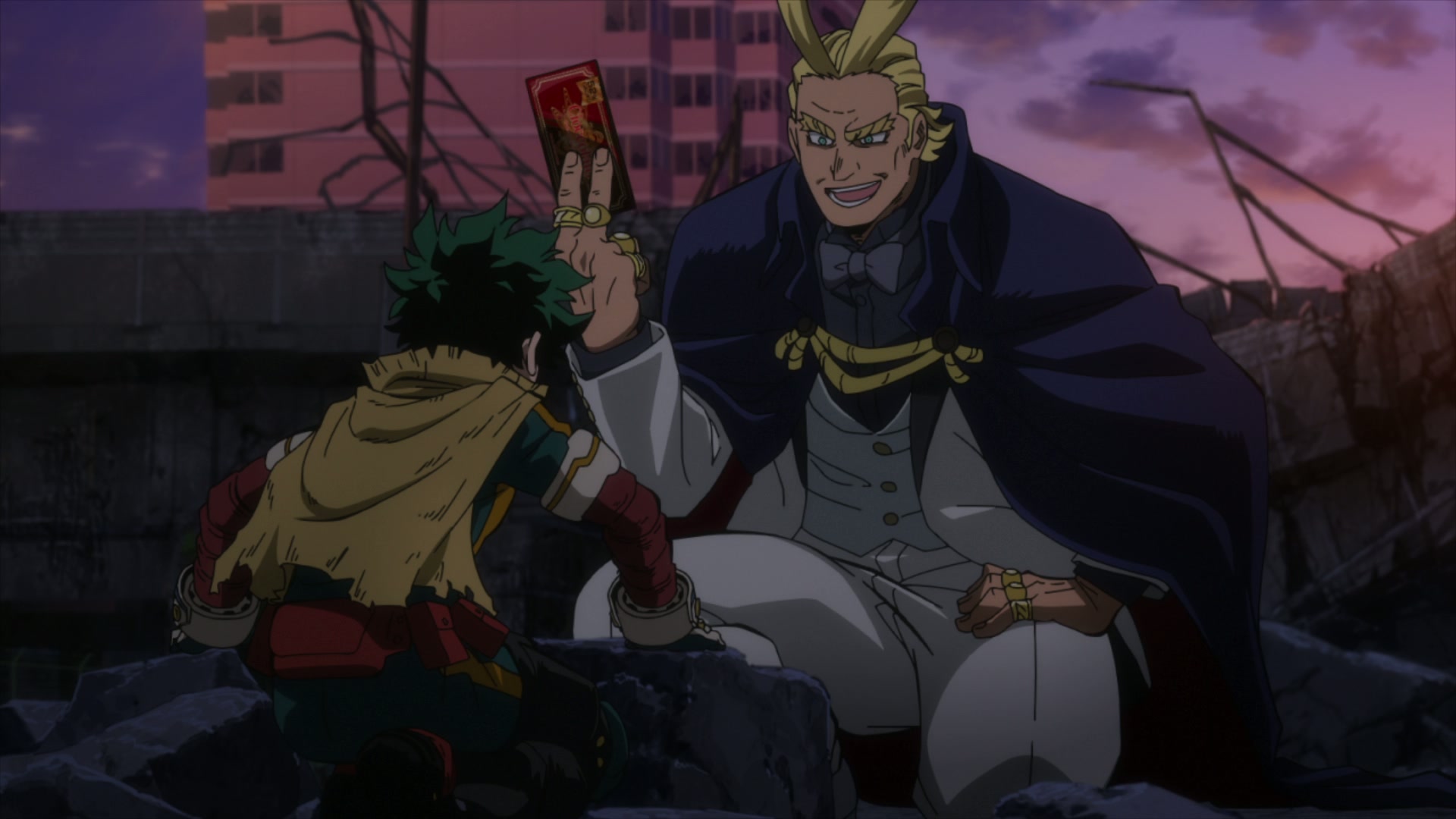 In a society devastated by the effects of an all-out war between heroes and villains, a mysterious giant fortress suddenly appears, engulfing towns and people one after another. Then, a man reminiscent of All Might, the 'symbol of peace', stands in front of Izuku and his friends...